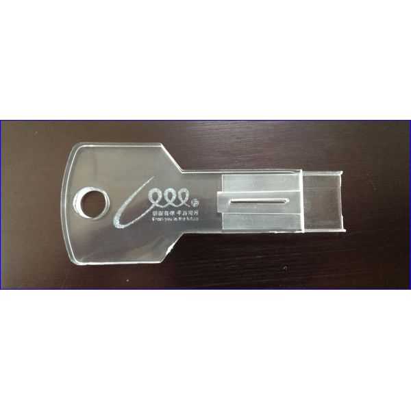 Acrylic thumb drive, transparent key shape. Inside 3D laser engraved logo, high-tech logo printing. LED light up the Logo while connecting computer or laptop, showing fantastic logo.
